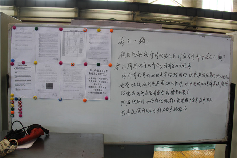安全副總陳輝講到,班前會是班組宣貫上級文件、規(guī)章制度、領(lǐng)導(dǎo)指示、會議精神,組織職工安全教育培訓(xùn),布置當(dāng)班安全生產(chǎn)工作任務(wù)的一個多功能會議,也是科學(xué)謀劃、統(tǒng)籌安排、合理組織、擬定完成作業(yè)計劃任務(wù)和各項指標(biāo)、保障安全生產(chǎn)的一個重要會議,開好班前會對安全生產(chǎn)的意義重大。陳總介紹,班前會分為八個流程:一、會議點名,職工進(jìn)入會議室,到召開班前會時間后,班(隊)長開始點名,并進(jìn)行班前安全確認(rèn);二、合唱會歌,共同歌唱“聚義職工三大紀(jì)律八項注意”;三、班前培訓(xùn),班(隊)長組織學(xué)習(xí)“每日一題”,學(xué)習(xí)內(nèi)容應(yīng)相對簡單,為本專業(yè)、崗位員工應(yīng)知應(yīng)會的內(nèi)容。對上一班“每日一題”所學(xué)內(nèi)容,進(jìn)行現(xiàn)場隨機(jī)抽人提問,回答不完整或錯誤時,再隨機(jī)抽人補充、指正。貫徹、學(xué)習(xí)規(guī)程、措施,上級部門、公司、廠(礦)有關(guān)文件、會議精神等;四、班組長點評,由班(隊)長對前一日當(dāng)班的安全生產(chǎn)情況進(jìn)行總結(jié)點評,重點對工作表現(xiàn)好的職工給予表揚或獎勵,表現(xiàn)差的給予提醒、批評或處罰;五、講任務(wù),由班(隊)長布置當(dāng)班生產(chǎn)任務(wù),具體分工責(zé)任到人,定人員,定任務(wù);六、講安全,班(隊)長根據(jù)當(dāng)班具體工作安排,有針對性地強(qiáng)調(diào)安全注意事項、防范措施,遵循“一原則、兩要點、三強(qiáng)調(diào)”;七、講質(zhì)量,根據(jù)當(dāng)班具體工作,班(隊)長強(qiáng)調(diào)相關(guān)施工技術(shù)參數(shù)及技術(shù)質(zhì)量要求;八、安全宣誓,班組長帶領(lǐng)全班職工舉起右拳進(jìn)行上崗前安全宣誓。